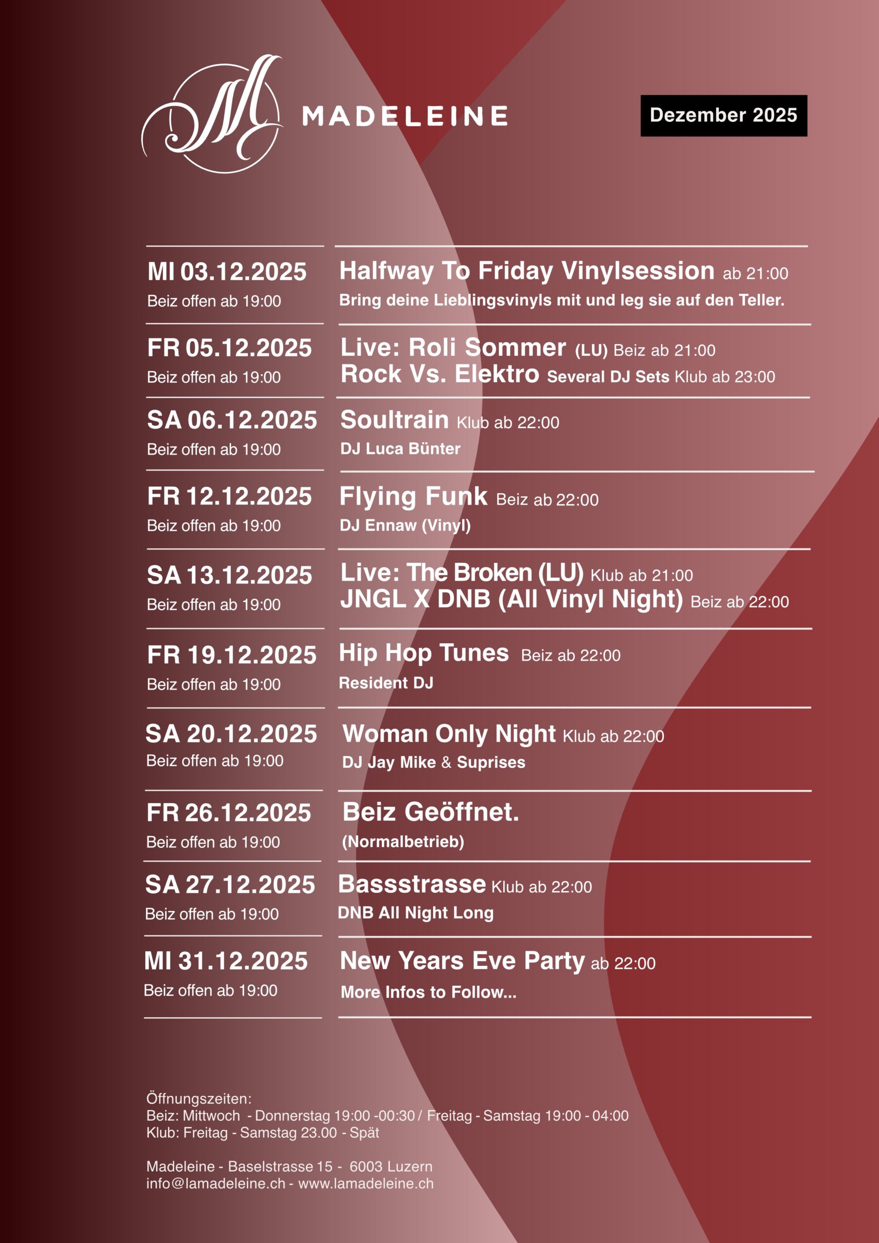 Mittwoch – Donnerstag 19.00 – 00.30 Uhr